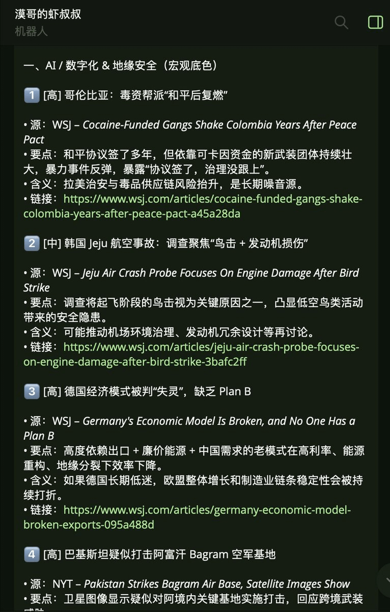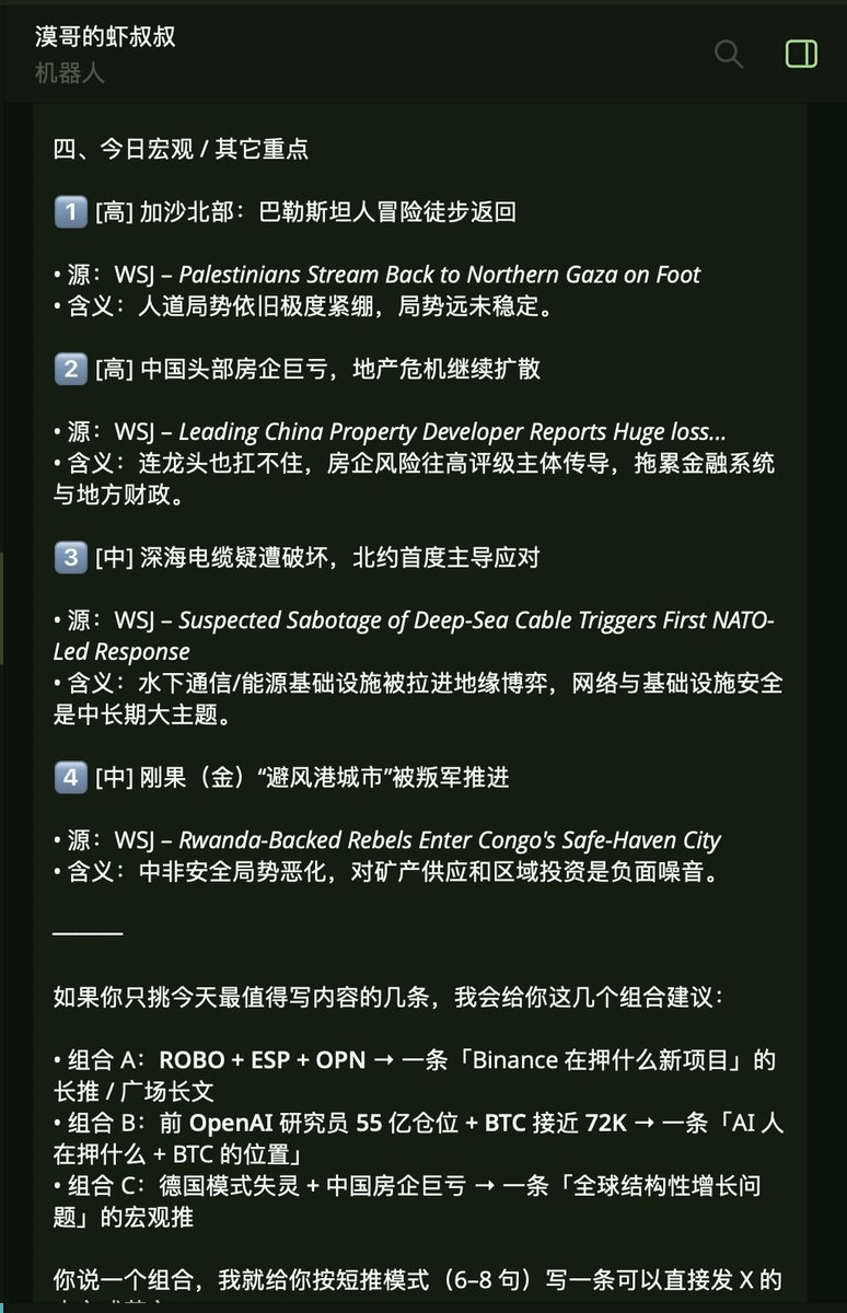 Bagi saya, pengalamannya seperti ini: saya tidak perlu membuka browser; saya secara otomatis menerima buletin yang dipersonalisasi di Telegram setiap pagi dan sore. Jika saya ingin memposting tweet, saya cukup memilih topik yang sedang tren dari berita pagi dan sore, dan Uncle Shrimp menghasilkan teks menggunakan algoritma X (saya sebelumnya telah memasukkan kode sumber terbuka algoritma X ke Uncle Shrimp). Saya hanya bertanggung jawab untuk langkah terakhir: pengambilan keputusan dan bersuara!