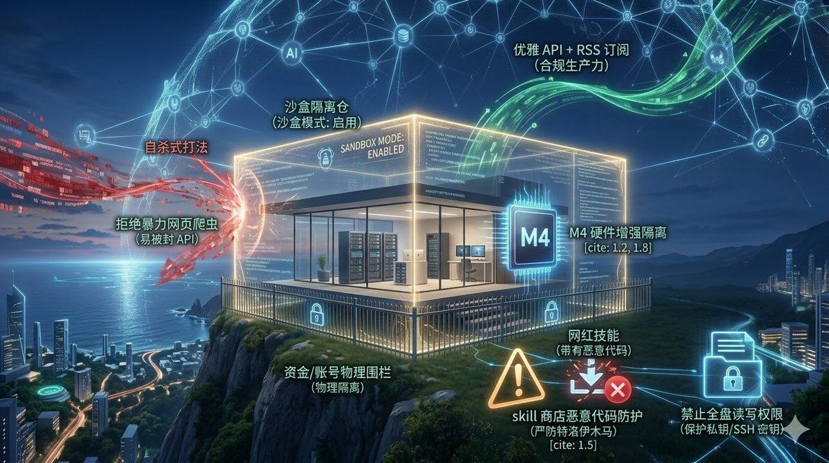 Batasan ketat: Mode sandbox harus diaktifkan! Jangan pernah memberikan izin baca/tulis penuh. Keuntungan menjalankannya secara lokal di Mac Mini M4 adalah kedaulatan fisik, menetapkan batasan fisik yang ketat untuk dana dan akun. Isolasi perangkat keras M4 yang dikombinasikan dengan isolasi logis sandbox menjadikannya ruang isolasi terbaik.