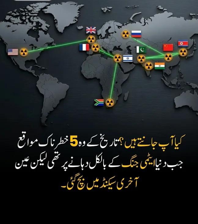 Kapten di dalam kapal selam merasa bahwa Perang Dunia Ketiga telah dimulai. Menurut hukum, diperlukan persetujuan dari tiga perwira untuk meluncurkan bom atom. Dua sudah setuju, tetapi Vasily Arkhipov menolak. Jika dia juga setuju, mungkin hari ini sebagian besar dunia akan menjadi kuburan yang gersang. 2. Stanislav Petrov: Pahlawan Alarm Palsu (1983) Di sebuah bunker Uni Soviet, Petrov tiba-tiba melihat di layar bahwa Amerika telah meluncurkan 5 rudal nuklir ke arah Rusia. Sistem berteriak bahwa serangan telah terjadi dan hanya tersisa satu menit untuk balasan serangan nuklir. Petrov menggunakan akalnya dan berpikir bahwa jika Amerika menyerang, mereka akan meluncurkan ribuan rudal, bukan hanya 5. Dia menganggap itu sebagai kesalahan sistem dan tidak melaporkannya ke atas. Kemudian terungkap bahwa itu benar-benar kesalahan teknis akibat refleksi sinar matahari dari awan. 3. Kecelakaan Roket Norwegia (1995) Radar Rusia melihat sebuah rudal mendekati perbatasan mereka yang terlihat persis seperti bom atom Amerika. Sebuah koper nuklir dibuka di depan Presiden Rusia saat itu, Boris Yeltsin, dan dia hampir menekan tombol. Dalam beberapa detik terakhir, terungkap bahwa rudal tersebut bukan bom atom, melainkan roket cuaca dari ilmuwan Norwegia yang bertujuan untuk penelitian aurora. 4. Kecelakaan Goldsboro: Bom Atom yang Pecah (1961) Sebuah pesawat tempur Amerika meledak di udara dan dua bom atom kuat di dalamnya jatuh di ladang North Carolina. Parasut salah satu bom terbuka dan ia tergantung di udara. Ketika para insinyur memeriksa bom tersebut, mereka berkeringat dingin. Tiga dari empat kunci pengaman bom telah terbuka. Hanya satu saklar kecil yang tersisa yang mencegahnya meledak. Jika itu meledak, jutaan orang akan segera menjadi korban. 5. Able Archer: Ketika Latihan Terasa Nyata (1983) Negara-negara NATO sedang melakukan latihan perang nuklir. Rusia merasa bahwa ini bukan latihan tetapi persiapan serangan. Angkatan Udara Rusia memuat bom atom ke pesawat mereka dan para pilot hanya menunggu perintah. Sebuah koper nuklir dibuka di depan Presiden Rusia saat itu, Boris Yeltsin, dan dia hampir menekan tombol. Dalam beberapa detik terakhir, terungkap bahwa rudal tersebut bukan bom atom, melainkan roket cuaca dari ilmuwan Norwegia yang bertujuan untuk penelitian aurora. 4. Kecelakaan Goldsboro: Bom Atom yang Pecah (1961) Sebuah pesawat tempur Amerika meledak di udara dan dua bom atom kuat di dalamnya jatuh di ladang North Carolina. Parasut salah satu bom terbuka dan ia tergantung di udara. Sistem berteriak bahwa serangan telah terjadi dan hanya tersisa satu menit untuk balasan serangan nuklir. Petrov menggunakan akalnya dan berpikir bahwa jika Amerika menyerang, mereka akan meluncurkan ribuan rudal, bukan hanya 5. Dia menganggap itu sebagai kesalahan sistem dan tidak melaporkannya ke atas. Kemudian terungkap bahwa itu benar-benar kesalahan teknis akibat refleksi sinar matahari dari awan. 3. Kecelakaan Roket Norwegia (1995) Radar Rusia melihat sebuah rudal mendekati perbatasan mereka yang terlihat persis seperti bom atom Amerika.