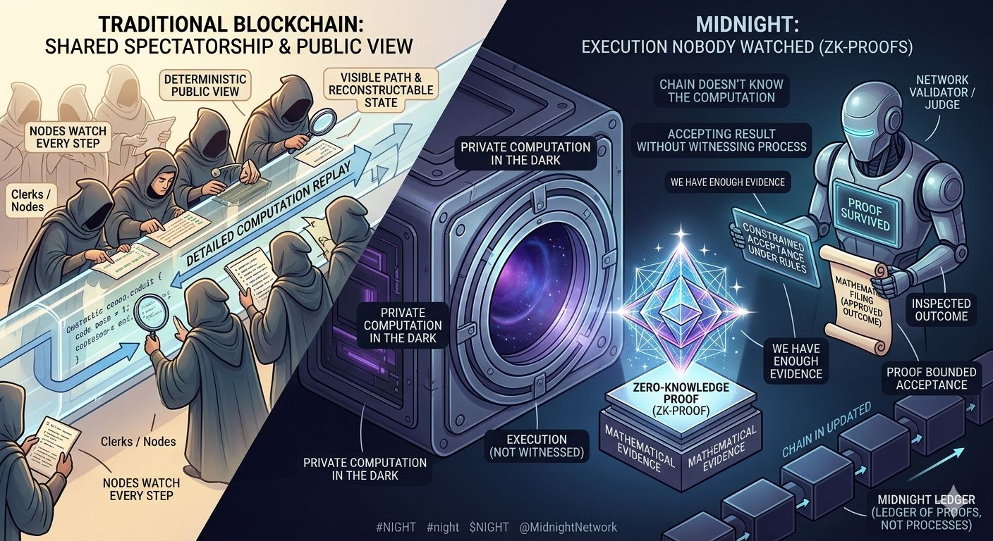 Ini secara fundamental mengubah apa yang dimaksud dengan “verifikasi” di dalam ruang terdesentralisasi. Di Midnight, verifikasi tidak lagi merupakan observasi kolektif. Ini adalah penerimaan yang dibatasi di bawah aturan kriptografi. Rantai tidak lagi mengatakan, “kita semua melihat ini terjadi.” Itu mengatakan sesuatu yang jauh lebih sempit, namun secara matematis lebih kuat: “kita memiliki cukup bukti yang tidak dapat disangkal untuk menerima bahwa itu terjadi dengan benar.”