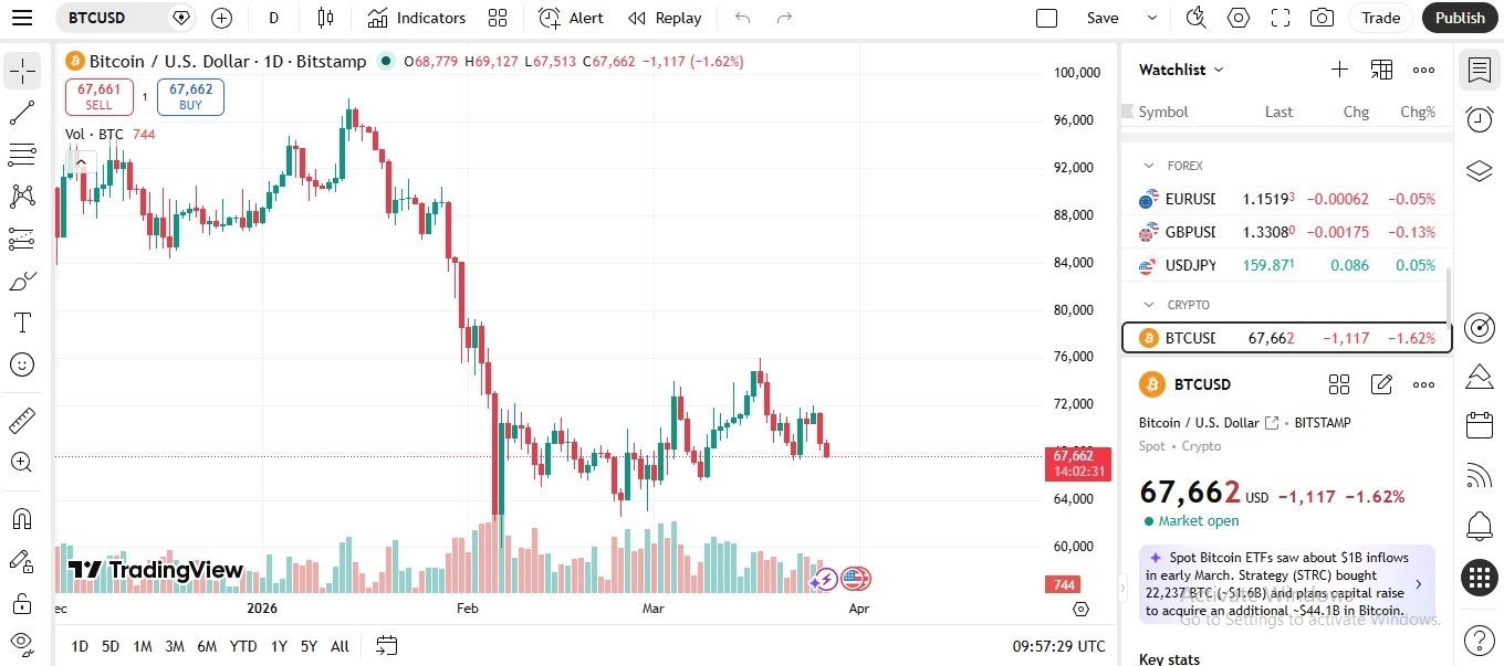 The Bitcoin daily chart (BTC/USD) shows a clear bearish trend followed by a period of consolidation. After reaching a high near the 90,000–95,000 range, the price experienced a sharp decline in early February, indicating strong selling pressure and a shift in market sentiment. This drop was accompanied by high trading volume, confirming the strength of the downtrend. Currently, Bitcoin is trading around 67,600 USD, with smaller candlesticks forming, which suggests reduced volatility compared to the previous sharp move.
