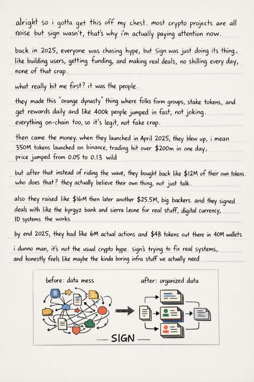 Most crypto stuff i see is loud on purpose and i think that’s why sign got ignored for a while. it wasnt screaming every day it was just moving in the back doing the boring work and honestly i pay more attention when a project does that. in 2025 everybody was chasing hype and sign was out there getting users raising money and closing real deals without acting like every post had to sound like a victory lap