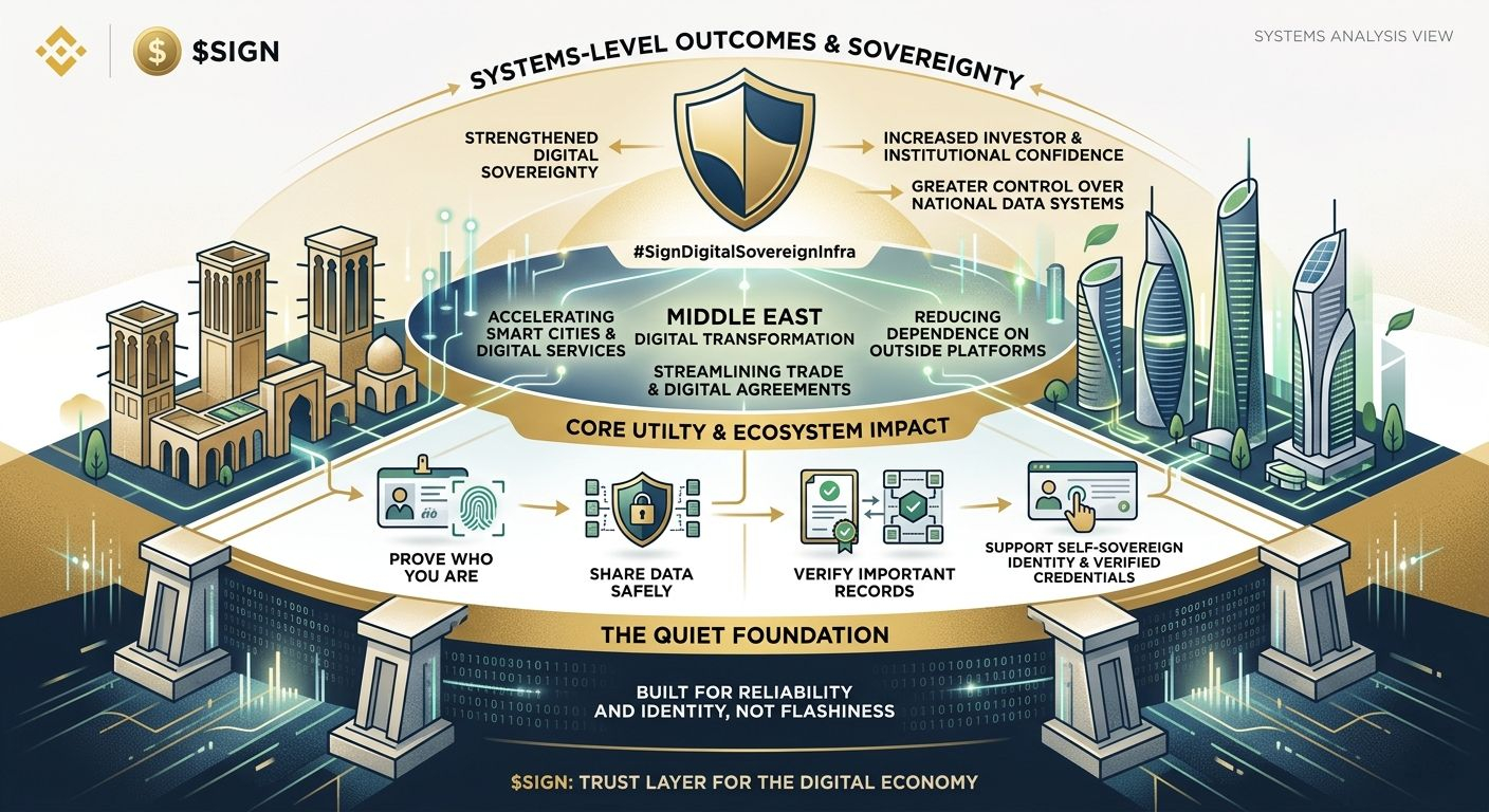 At its core $SIGN feels less like another crypto project and more like a trust layer for the digital economy. It is built to help people and systems prove who they are share data safely and verify important records with confidence. That matters because modern digital life depends on identity and reliability just as much as speed. In the Middle East this idea is especially important because governments and businesses are moving fast toward smart cities digital services and cross border trade. #SignDigitalSovereignInfra can support self sovereign identity verified credentials and secure authentication which makes it easier for people and organizations to interact without unnecessary friction. It can also help streamline trade finance and digital agreements while giving countries more control over their own data and systems. This kind of infrastructure can reduce dependence on outside platforms strengthen sovereignty and build more confidence for investors and institutions. In simple terms SIGN is not trying to be the flashy front end that everyone notices. It is aiming to become the quiet foundation that helps digital economies grow more safely efficiently and independently.