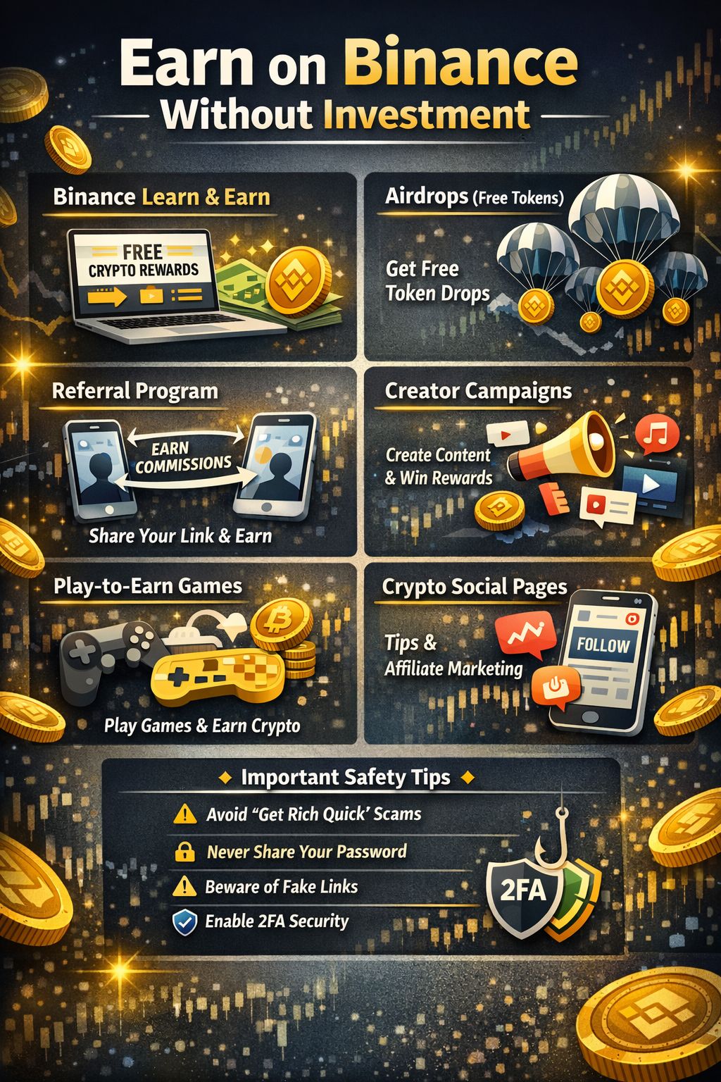 Binance and various crypto projects occasionally distribute free tokens to users through airdrops. Participation may involve: