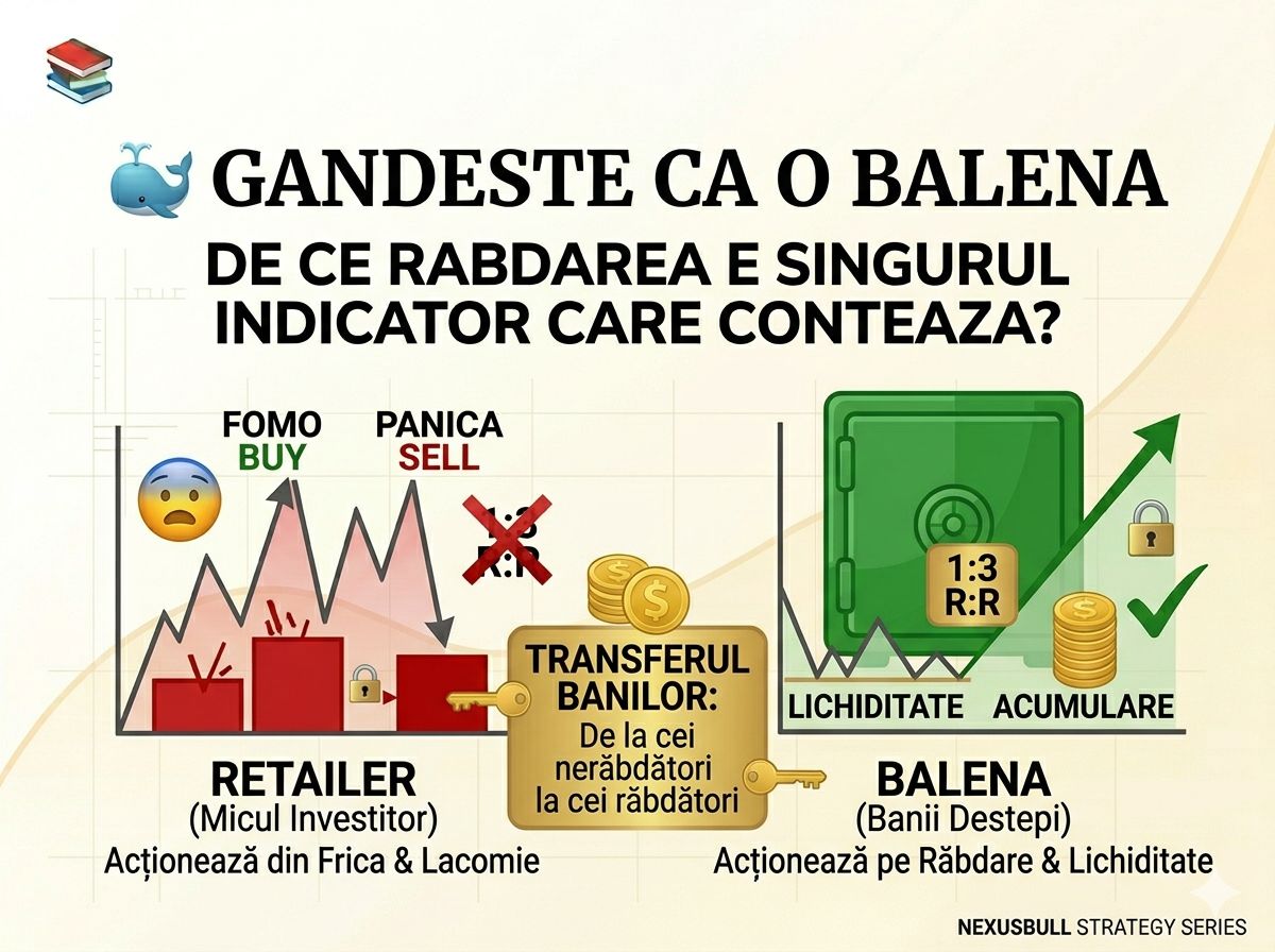 I'm telling you man... majoritatea retailerilor (adica „pestisorii”) intra in piata cu o mentalitate de victima, chiar daca nu vor sa admita asta. Ei alearga dupa profituri de 100% peste noapte, se panicheaza la o corectie de 5% si cumpara mereu cand e „verde” pe tot ecranul. Balenele? Balenele joaca un cu totul alt sport. Ele nu cauta „pump-ul”, ele cauta Lichiditatea.
