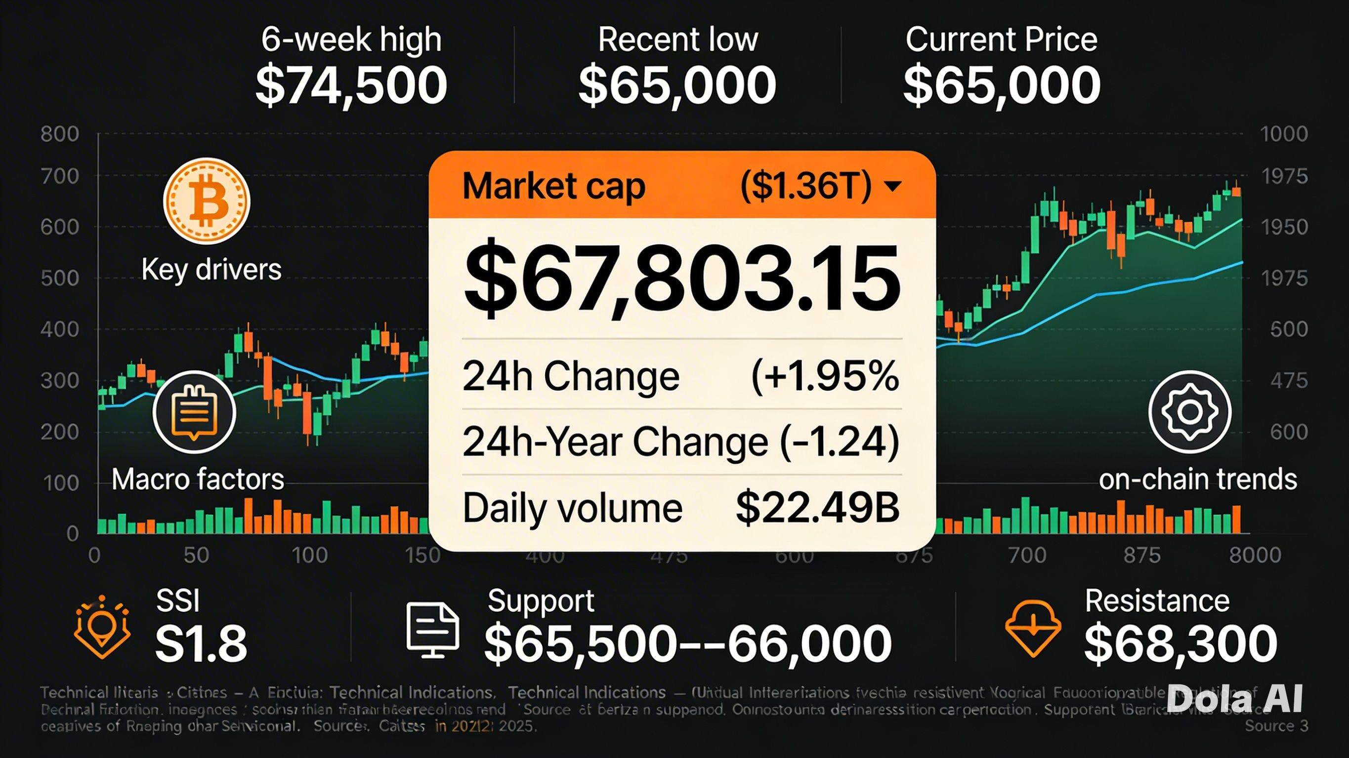 - Harga Saat Ini: $67,803.15 dengan peningkatan 1.95% dalam 24 jam, diperdagangkan antara $65,000 (rendah) dan $67,899.99 (tinggi) dalam sehari terakhir. Ini memiliki kapitalisasi pasar sebesar $1.36 triliun dan penurunan 7-hari sebesar 1.24% .