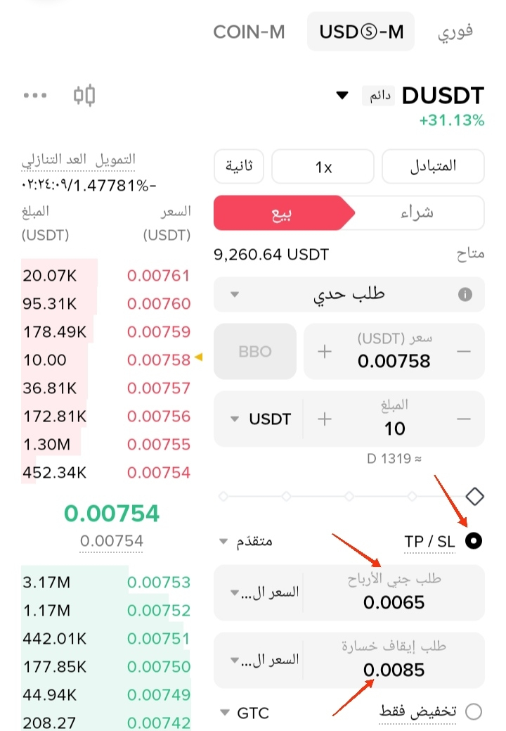 : لا تفتح صفقة أبداً دون تفعيل خيار TP / SL الواضح في الصورة. حدد أهدافك وخسائرك قبل الدخول.