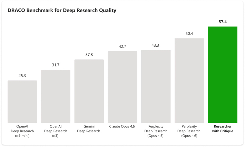 Sur le benchmark DRACO — un test standardisé couvrant 100 tâches de recherche complexes dans 10 domaines, dont la médecine, le droit et la technologie — Copilot avec Critique a obtenu 57.4. points, tandis que la seule version d’Anthropic Claude Opus 4.6 a obtenu 42.7, atteignant à elle seule 57.4. Le système combiné de Microsoft bat le meilleur résultat suivant d’environ 14%.