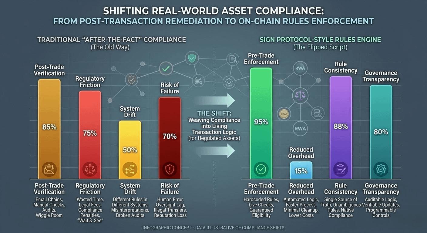 Sign just… flips the script. Instead of scrambling afterward, it weaves the rules right into the transaction itself. The protocol isn’t sitting around waiting for someone to remember the policy manual. It already knows: Is this buyer eligible? Can the asset even go there? Does the cooldown apply? Does the jurisdiction check out? Does the proof stack actually pass? Compliance stops being this separate after-party ritual and just becomes part of how the machine works. The transfer either sails through clean or it simply doesn’t happen. No drama.