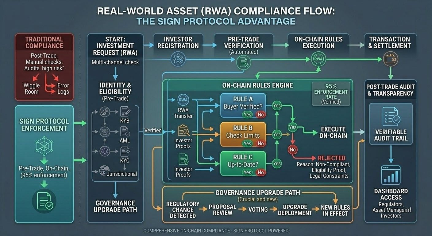When I step back, Sign isn’t just helping systems prove things. It’s quietly turning legal conditions into living transaction logic. The protocol isn’t politely watching from the sidelines anymore; it’s right there in the flow, actively enforcing. For serious regulated assets, that might be exactly where the infrastructure needs to sit. Compliance that only lives in documents is easy to sidestep. Compliance that lives inside the transaction path? A lot harder to ignore.