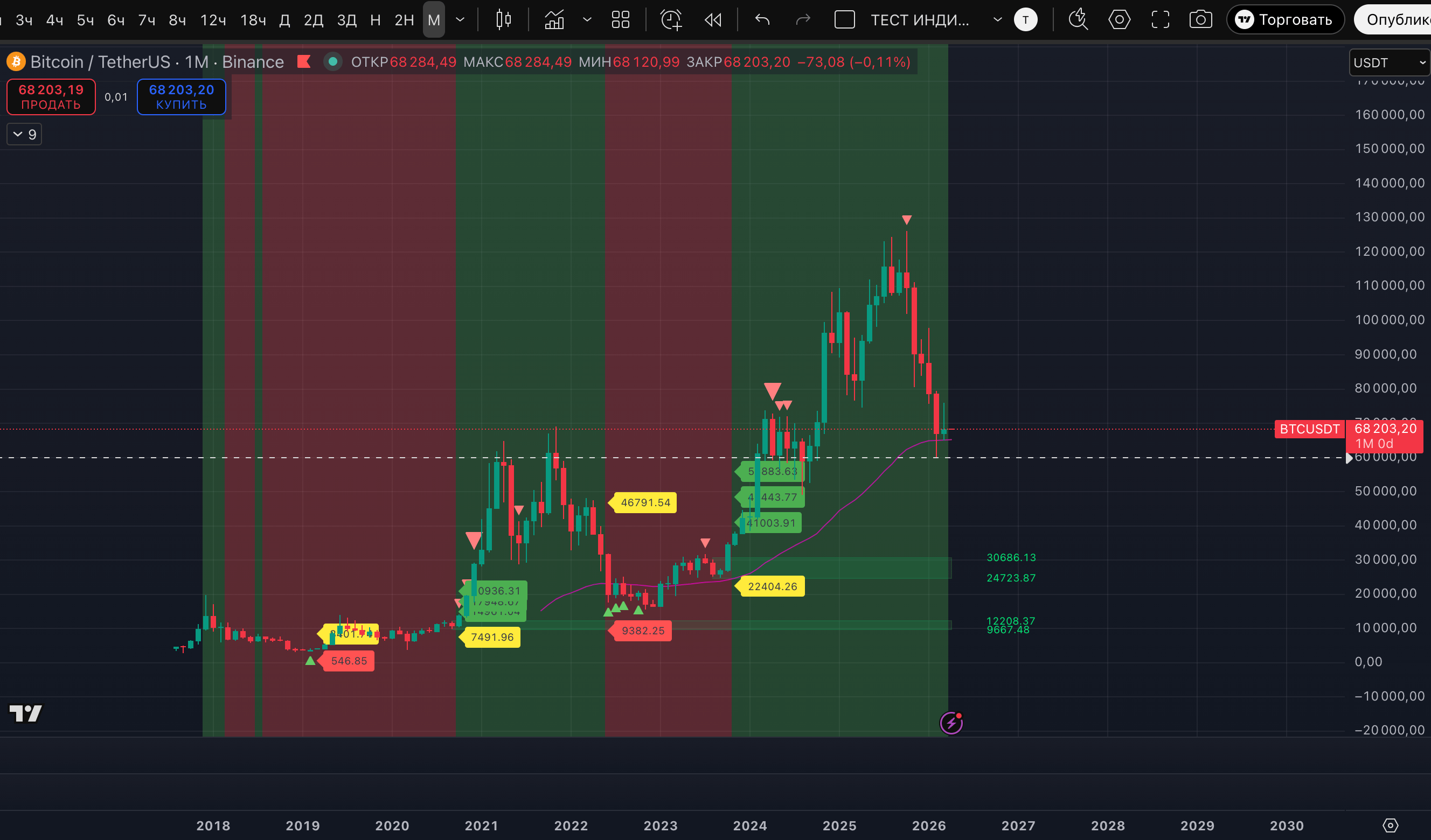 Pertama-tama penting - rangkaian lilin bulanan merah yang terputus, yang telah berlangsung sejak September 2025. Perlu dicatat, Oktober 2025 adalah yang pertama merah dalam rangkaian bulan yang panjang dan dibuka dengan kurs 114 048$ dengan tanda potensi puncak menurut indikator kami.