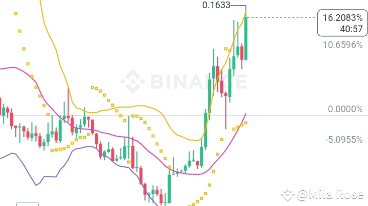 Il prezzo di $0.1606 è vicino alla banda di Bollinger superiore di $0.1619, indicando un forte movimento al rialzo, ma potenzialmente raggiungendo una zona di ipercomprato.