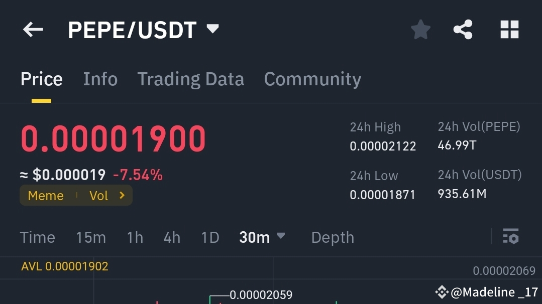 La coppia di trading $PEPE/USDT è entrata in un punto critico, riflettendo un'intensa attività di mercato e una volatilità elevata. Attualmente scambiata a 0.00001900, la coppia ha registrato un forte calo del 7,54% nelle ultime 24 ore. Questo movimento segnala una lotta tra acquirenti e venditori mentre il token si avvicina a un livello di supporto chiave a 0.00001871, che potrebbe determinare la sua prossima direzione.