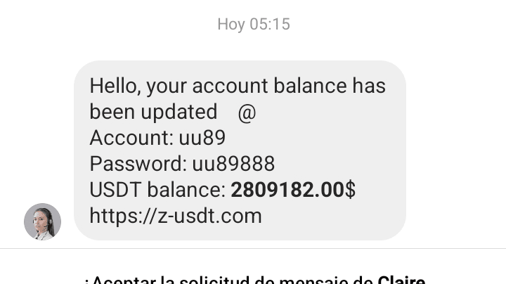 Il messaggio viene condiviso insieme ad un link Lo scopo è che l'utente entri nel sito in questione, con i dati forniti. Così facendo si entra in una pagina in cui appare un saldo con una grossa somma di USDT. In questo modo cerchi di catturare l'attenzione della persona.