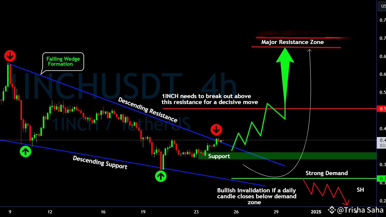💎Dopo un lungo periodo di consolidamento, #1INCHUSDT sta formando un chiaro modello di Falling Wedge, una struttura che spesso suggerisce un potenziale inversione rialzista. Il prezzo è attualmente intrappolato tra Resistenza Discendente e Supporto Discendente, che si stringe sempre di più ad ogni movimento. La domanda è: i tori finalmente si faranno avanti per liberarsi?