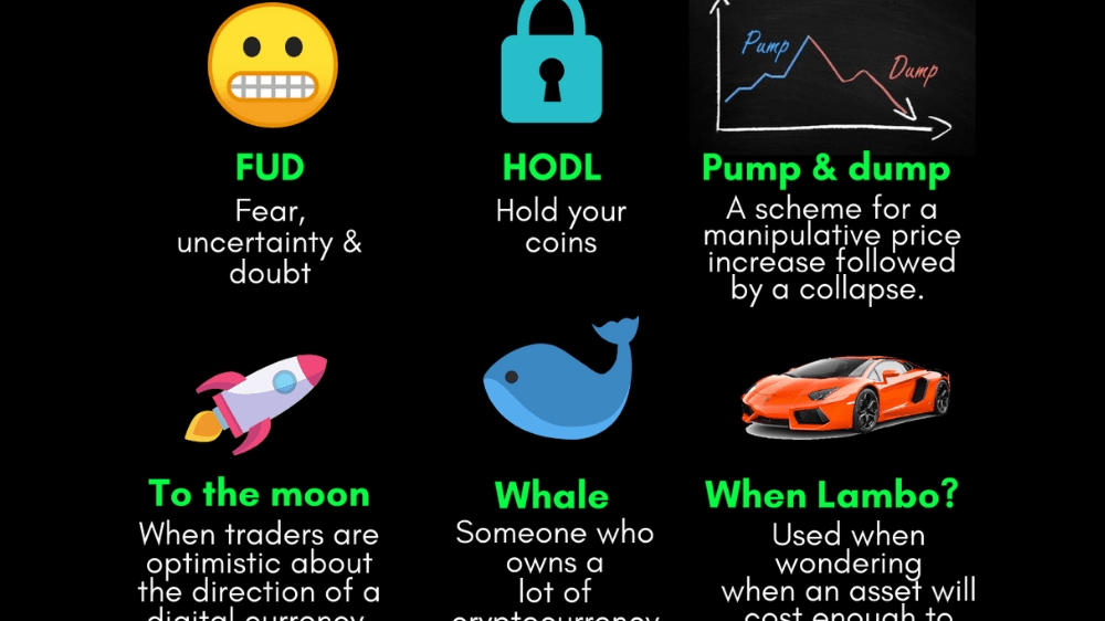 #LAMBO: Il termine utilizzato è l'abbreviazione di Lamborghini, a indicare la rapidità con cui ci si può aspettare di diventare ricchi, date le attuali condizioni di mercato. Viene spesso utilizzato anche per indicare il contrario: che qualcuno perde molti soldi durante le recessioni.