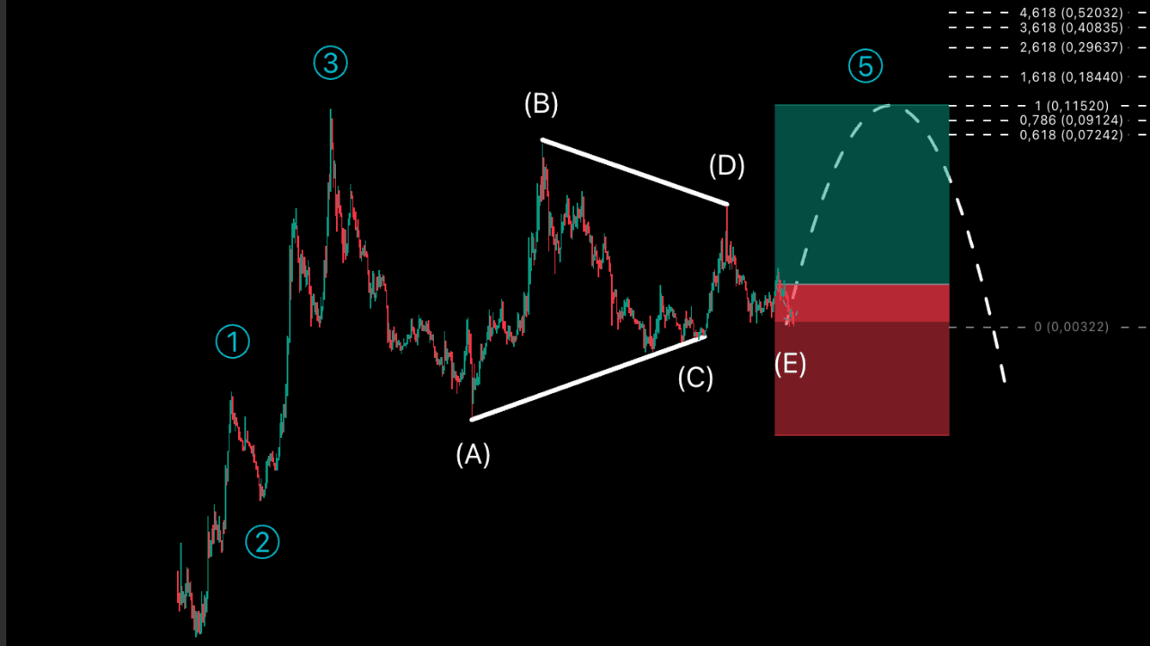 Sul grafico SC/USD (1H) osservo il completamento dell'onda correttiva (4) all'interno della struttura impulsiva a 5 onde di Elliott. La correzione si è sviluppata nel formato ABCDE (triangolo contrattivo), che spesso precede una forte rottura.