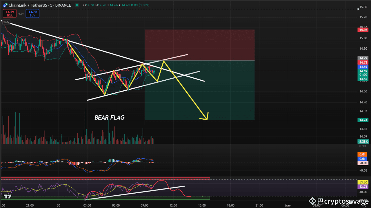 LINK sta attualmente formando un pattern di bandiera ribassista sul grafico a 5 minuti. Mi aspetto un movimento verso la regione di $14.80 per toccare il blocco d'ordine ribassista. Inoltre, l'RSI si sta avvicinando alla zona di offerta, il che aggiunge confluenzia a un potenziale setup short attorno a quel livello.
