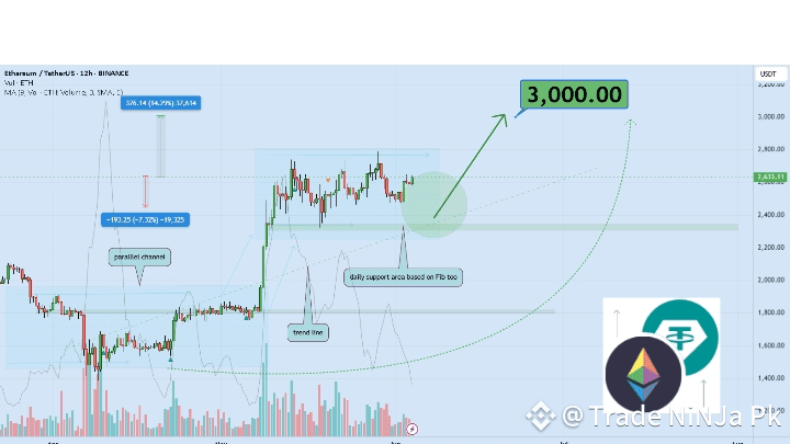 L'azione recente del prezzo di Ethereum nel grafico di Binance a 12 ore mostra chiaramente segni di una continuazione rialzista. Dopo un solido rimbalzo da una zona di supporto chiave, ETH sembra prepararsi per un movimento verso il livello di $3.000.
