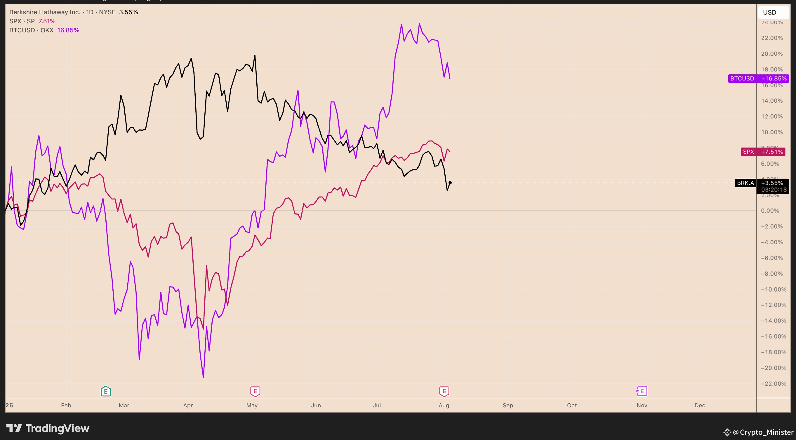 A partire da martedì, le azioni di Berkshire sono aumentate solo del 3,55% da inizio anno. Al contrario, l'S&P 500 ha guadagnato il 7,51%, mentre Bitcoin è aumentato del 16,85%.