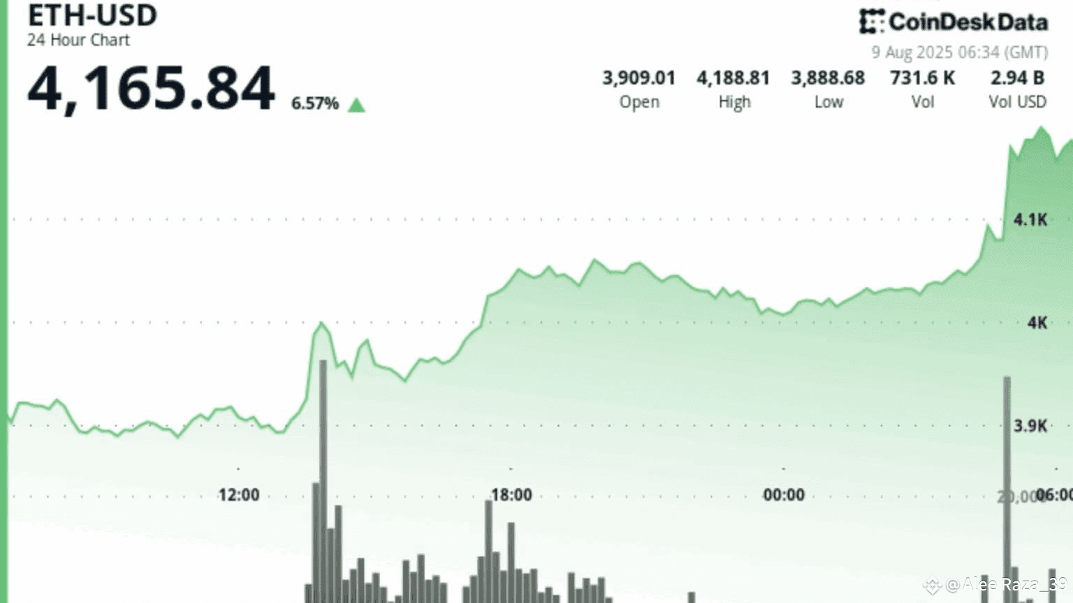Secondo l'analisi tecnica, il prezzo dell'ETH è aumentato da 3.914,59 dollari l'8 agosto a 4.160,29 dollari il 9 agosto, mentre il volume degli scambi è stato tre volte superiore al normale, con un aumento di prezzo significativo attraverso due importanti breakout, e infine il prezzo è salito sopra i 4.190 dollari, ma è stata anche osservata una certa diminuzione a causa del profit taking.