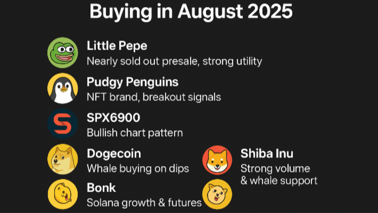 Nell'agosto 2025, grandi investitori (chiamati anche balene) stanno acquistando alcune monete meme in grandi quantità. Questo mostra quali monete hanno una forte domanda e possibile crescita. Ecco le prime 6 monete meme: