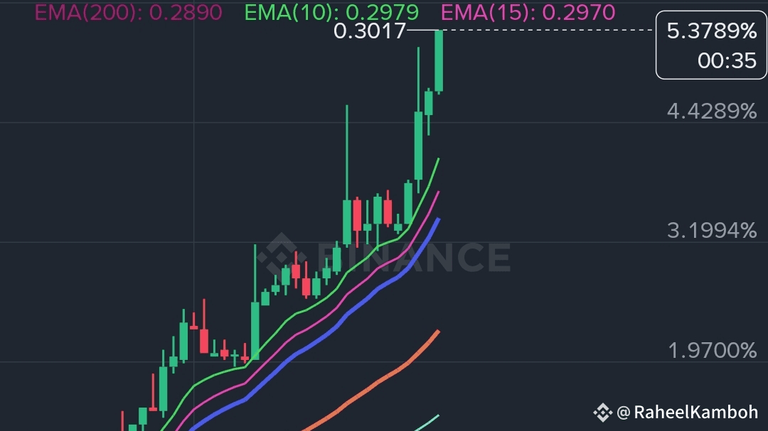 · TENDENZA & MAs: Il prezzo sta scambiando SOPRA TUTTE LE EMA CHIAVE (10, 20, 50, 100, 200)! Il nastro EMA è bullish e si sta espandendo. Questa è una tendenza al rialzo da MANUALE. La 20 EMA (0.2962) è ora il tuo supporto.