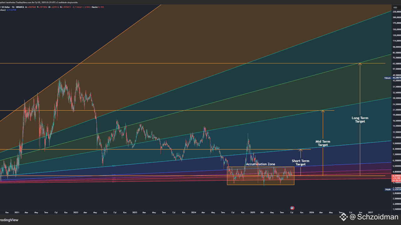 ⚪ Costruzione della base: Maggiore tempo in $3.50–$5.40. Tattiche di range (comprare vicino al supporto, ridurre in caso di resistenza) fino a una rottura decisiva.