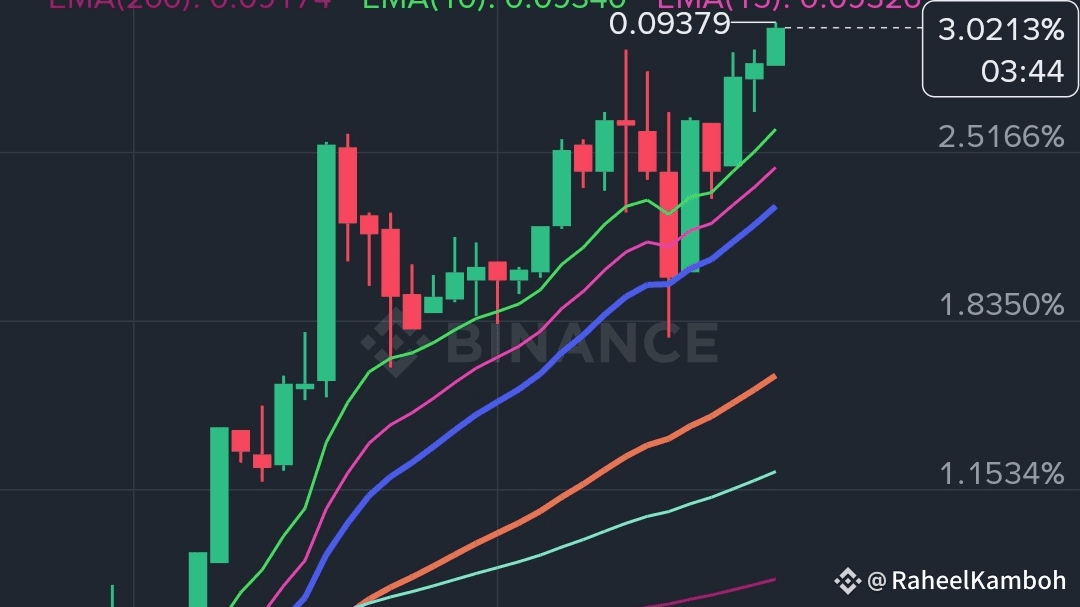 · 🎯 AZIONE PREZZO & MODELLI: Il prezzo sta negoziando SOPRA TUTTE le principali Medie Mobili Esponenziali (EMA 10, 20, 50, 100, 200)! Questo è il segno più chiaro di una forte tendenza bullish. Il grafico suggerisce una potenziale formazione a TRIANGOLO ASCENDENTE, con minimi più alti e una resistenza statica intorno a $0.0940. Una rottura sopra questo potrebbe innescare un movimento significativo verso nord.