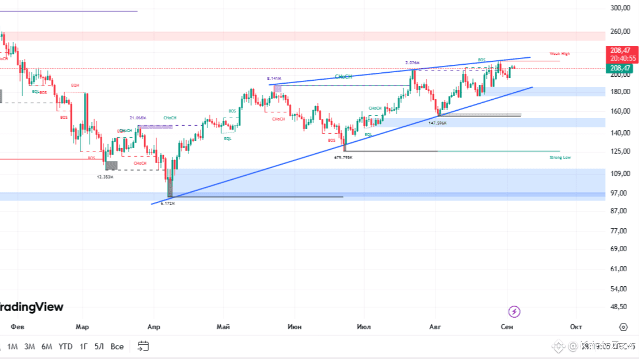 L'analisi tecnica mostra che il prezzo di SOL si mantiene sopra la chiave linea di supporto crescente nella fascia $190-200. Questo crea una base per una ulteriore crescita con obiettivi previsti tra $225-291 nei prossimi mesi.