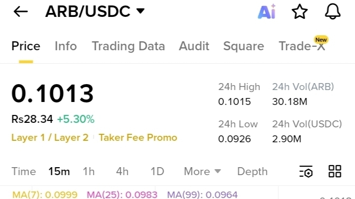 $ARB mostra una forte momentum rialzista sul grafico a 15 minuti. Il prezzo è attualmente intorno a $0.1013, in aumento di oltre il 5% oggi. Abbiamo appena assistito a una chiara rottura sopra il livello di $0.1000 con un volume crescente — i compratori sono chiaramente attivi.