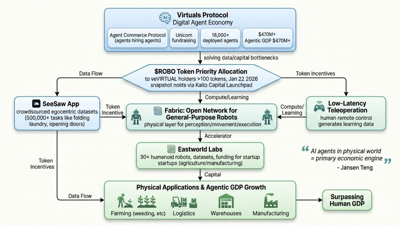 Questa collaborazione sposta l'attenzione da un PIL digitale puramente a qualcosa di molto più grande. Virtuals lo chiama "PIL Agentico." Inizialmente, questo si riferiva a agenti AI che scrivono codice o creano arte digitale. Ora, comprende robot che costruiscono case, raccolgono colture e lavorano nelle linee di assemblaggio. Jansen Teng di Virtuals ha proposto una visione audace: questo PIL presto guiderà l'attività economica globale e supererà il PIL umano solo quando gli agenti AI saranno presenti nel mondo fisico. Il Fabric è la chiave che sblocca quella presenza fisica.