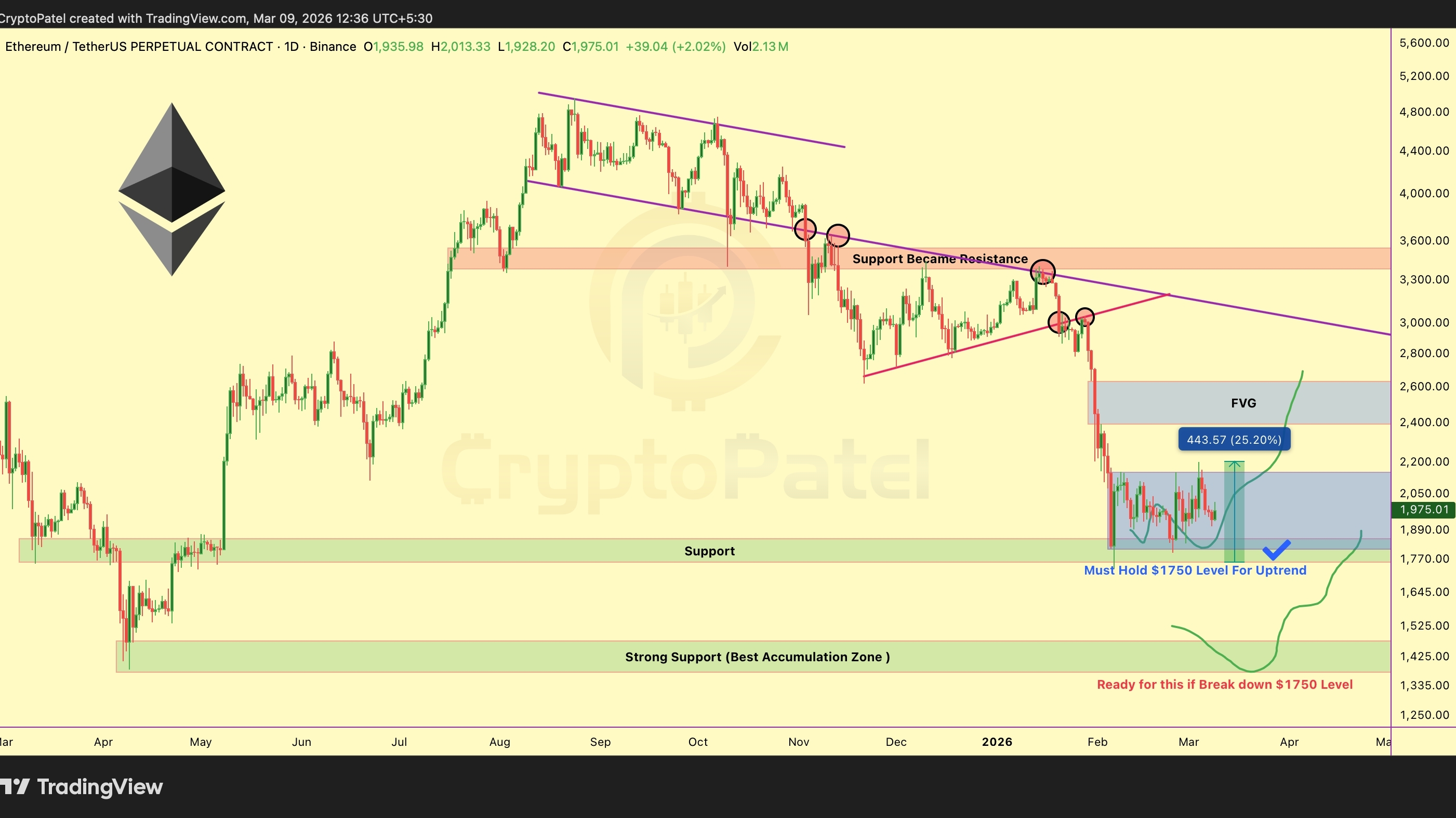 Ribassista: Rompere sotto $1,750 con volume, prossima fermata $1,470-$1,370. Questa diventa la migliore zona di accumulo per un profitto massiccio a lungo termine.