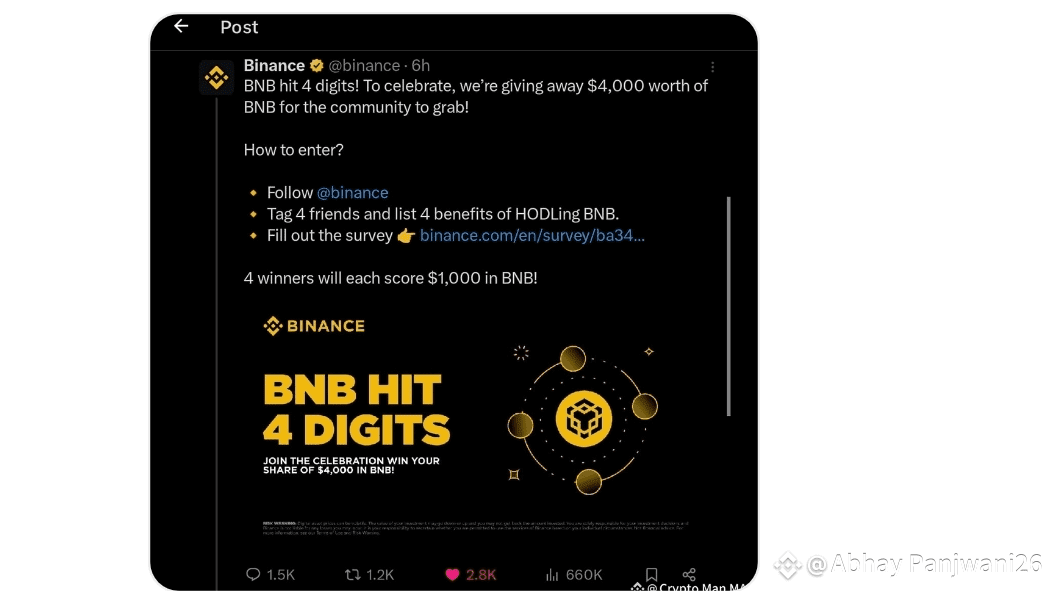 BNB ha recentemente superato le 4 cifre, e Binance sta celebrando con un giveaway di 4.000 BNB. Per partecipare, gli utenti devono seguire Binance, menzionare 4 amici e elencare 4 vantaggi del detenere BNB. Molti investitori stanno già godendo di forti guadagni, come dimostrato dal recente rialzo del +7,75% di BNB e un profitto superiore al 39% negli ultimi 30 giorni. Ciò evidenzia la forza di BNB come criptovaluta leader con crescita, ricompense e supporto della community.
