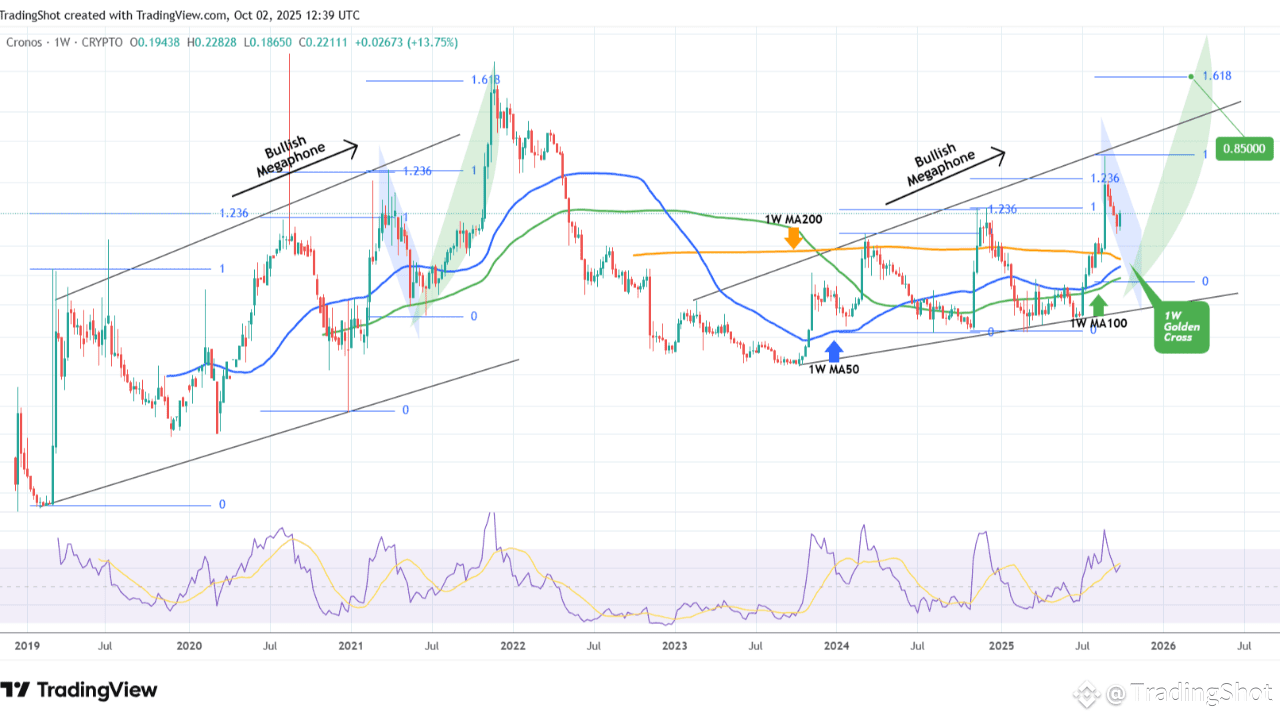 Cronos (CROUSD) è stato scambiato all'interno di un Megafono Rialzista per tutta la durata del suo attuale Ciclo Rialzista. Prima del suo primo Golden Cross 1W, il modello presenta molte somiglianze con il Megafono Rialzista del Ciclo precedente.