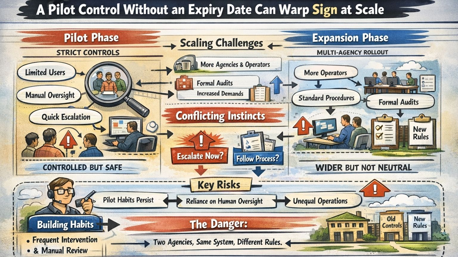 Ecco il meccanismo che mi preoccupa. In modalità pilota, i controlli manuali sembrano responsabili. Un set di utenti ristretto rende la revisione ravvicinata conveniente. Un forte monitoraggio cattura i casi limite. Gli operatori imparano che la cosa più sicura non è sempre lasciare che il percorso formale si svolga da solo. Imparano che l'intervento è normale. Poi il sistema si espande. Più agenzie entrano. Più operatori toccano il flusso. Le verifiche diventano più formali. Le aspettative di servizio aumentano. Ma le persone all'interno del sistema potrebbero ancora utilizzare i riflessi del pilota. Un team escalera presto perché è ciò che ha reso il pilota sicuro. Un altro si aspetta che il percorso formale regga perché il sistema dovrebbe essere maturo ora. La pila sembra standardizzata. La cultura operativa non lo è.