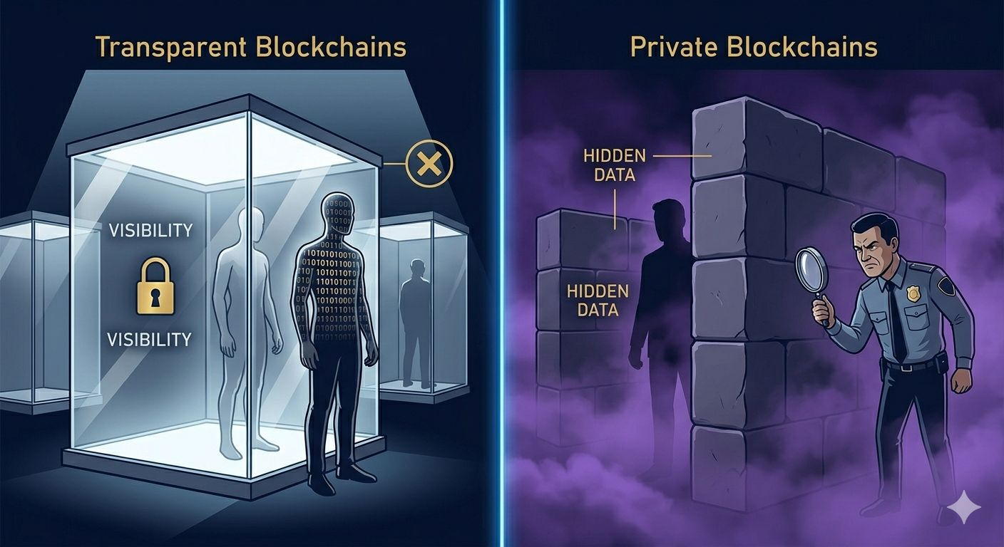 Transparent blockchains (like Bitcoin or Ethereum) → everything is visible, which is good for trust but exposes sensitive information
