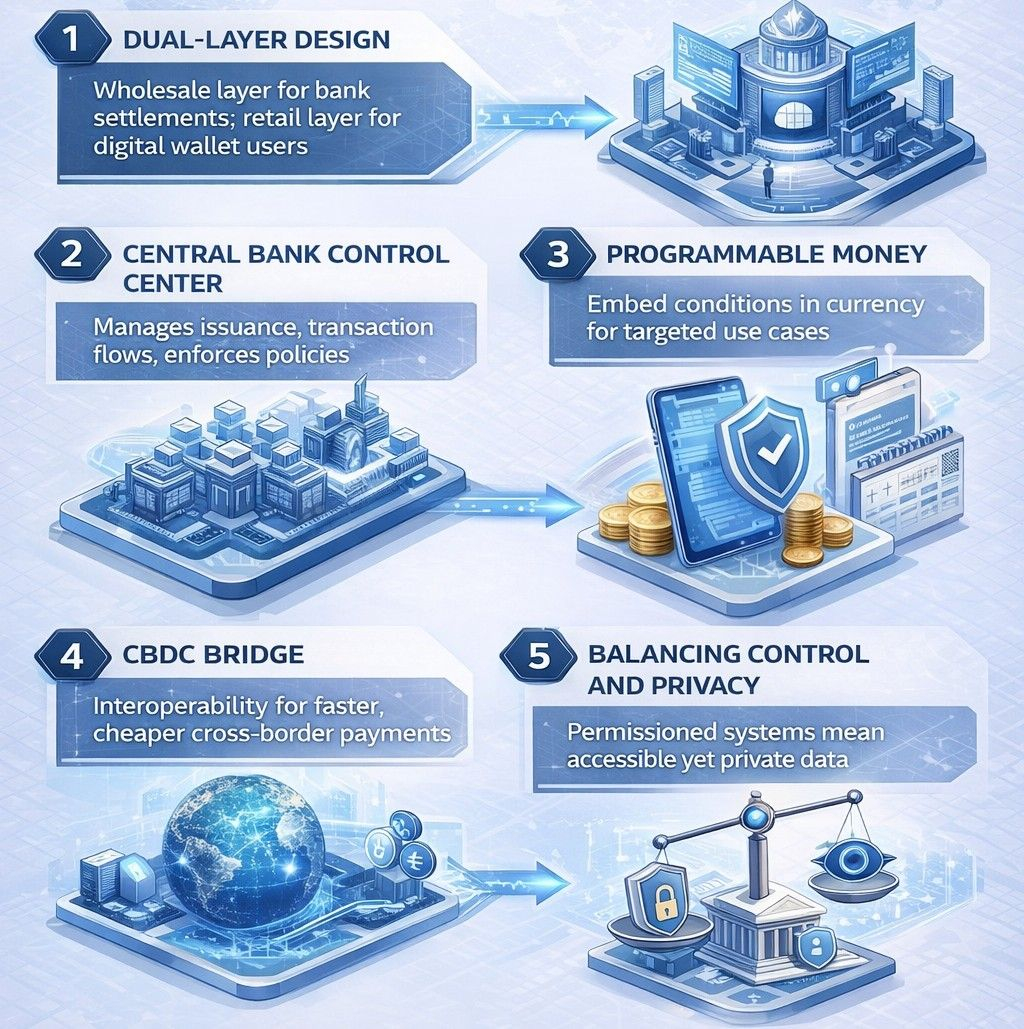 The wholesale layer is built for central banks and commercial banks, using a private or permissioned blockchain to handle interbank settlements more efficiently, potentially reducing processes that traditionally take days into near real-time execution.