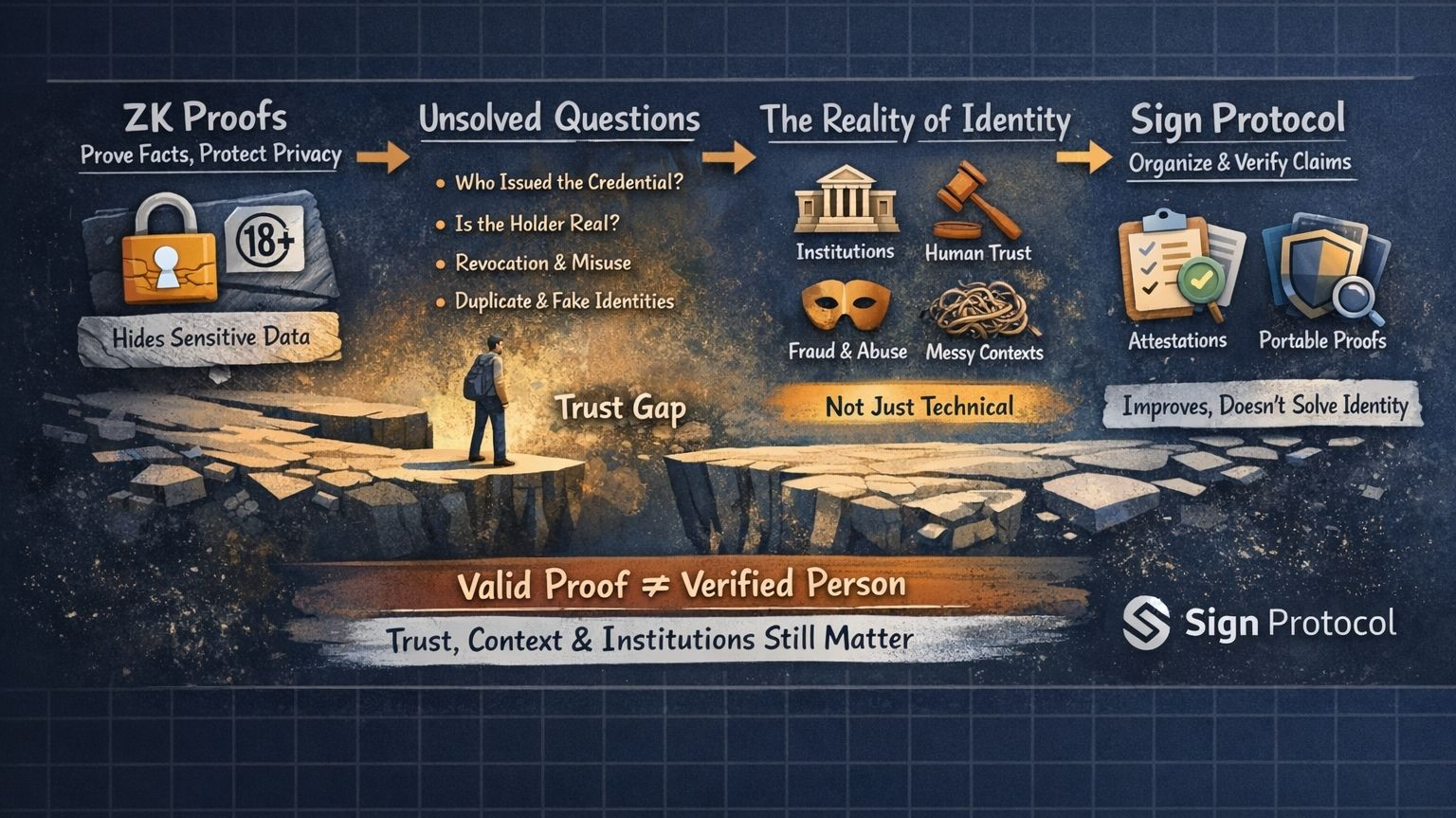 Una prova può mostrare che i dati nascosti soddisfano una condizione. Può mostrare che una credenziale è stata emessa correttamente, che una firma è valida, che un'affermazione si adatta alla struttura richiesta, che è stata raggiunta una certa soglia senza esporre l'input grezzo. Questo è un serio miglioramento nel modo in cui i sistemi possono operare. Ma l'identità non finisce dove inizia la verifica. L'identità è dove la verifica collide frontalmente con il contesto.