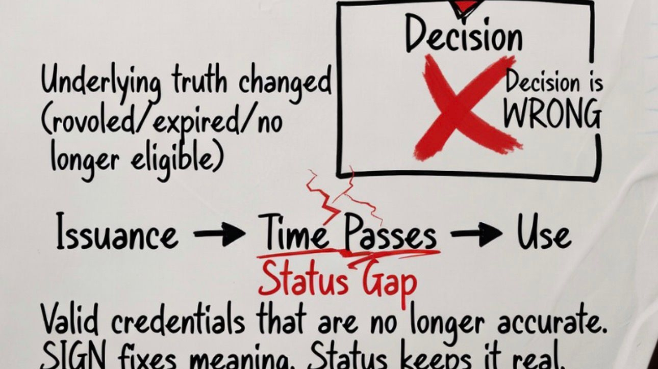 Qui è dove le cose iniziano a rompersi in modo silenzioso. La credenziale sembra valida. La verifica passa. Non c'è errore visibile. Ma la decisione basata su di essa è sbagliata perché lo stato sottostante è già cambiato.