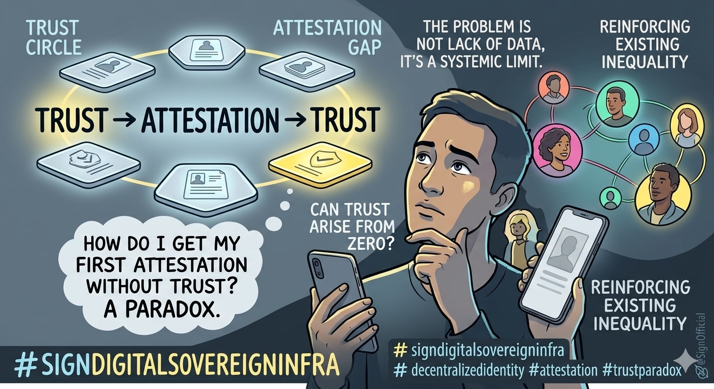 Càng tìm hiểu càng thấy vấn đề không nằm ở việc người mới thiếu attestation. Vấn đề là hệ thống không tạo ra một không gian để trust có thể xuất hiện lần đầu một cách tự nhiên. Khi mọi thứ đều cần được xác nhận, thì những gì chưa được xác nhận gần như bị coi là không tồn tại. Điều này khiến trust trở thành thứ có tính tích lũy rất mạnh: ai đã có thì càng dễ có thêm, còn ai chưa có thì càng khó bắt đầu.