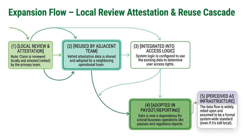 That’s what makes this pattern hard to catch. Nothing breaks. The attestation remains valid. The data is correct. The systems are functioning. But the meaning has stretched beyond what anyone formally agreed to.