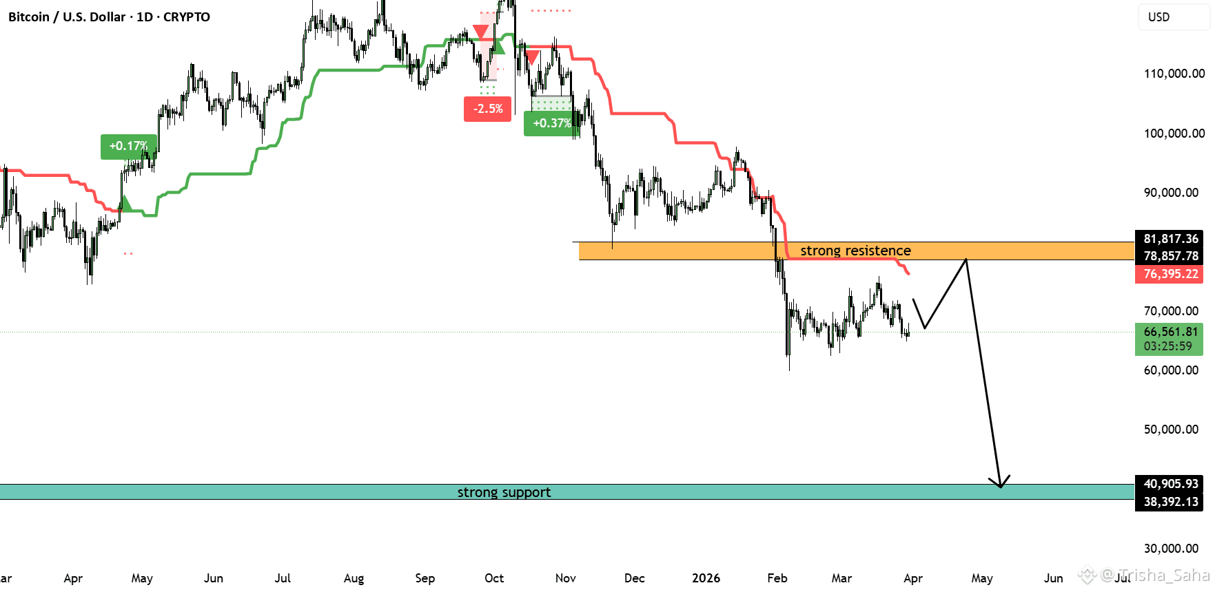 تظهر حركة السعر ارتفاعات أقل وانخفاضات أقل باستمرار، مدعومة بمقاومة ديناميكية هابطة (خط أحمر)، مما يشير إلى ضغط هبوطي مستمر. يبدو أن التوحيد الأخير حول منطقة 66K هو توقف مؤقت بدلاً من انعكاس.