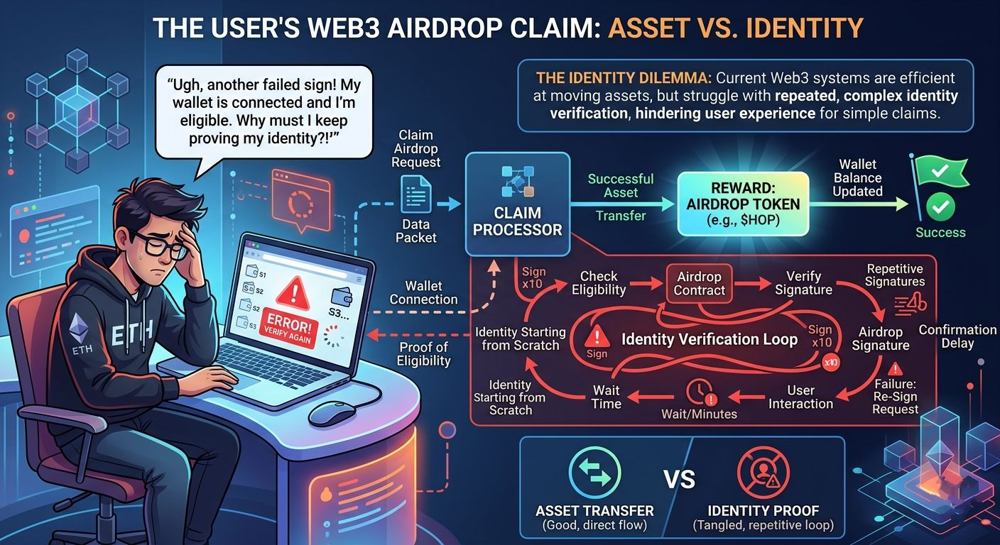Ricordo un pomeriggio seduto di fronte al mio schermo cercando di richiedere un semplice airdrop. Tutto sembrava perfetto. Il mio portafoglio era connesso. La transazione sembrava pronta. Avevo la prova di idoneità. Eppure ogni volta che ci provavo, l'app mi chiedeva di verificare di nuovo. Un'altra firma. Un'altra attesa. Quello che doveva essere un processo di due secondi si è trasformato in minuti. Non era un'operazione ad alto rischio o qualche manovra complessa di DeFi. Era solo dimostrare che ero idoneo. E sembrava impossibile. Quel momento mi ha fatto rendere conto di qualcosa di importante. Siamo diventati davvero bravi a muovere denaro e beni attraverso le blockchain. Ma dimostrare qualcosa di semplice come la nostra stessa identità sembra ancora come ricominciare da capo ogni volta.