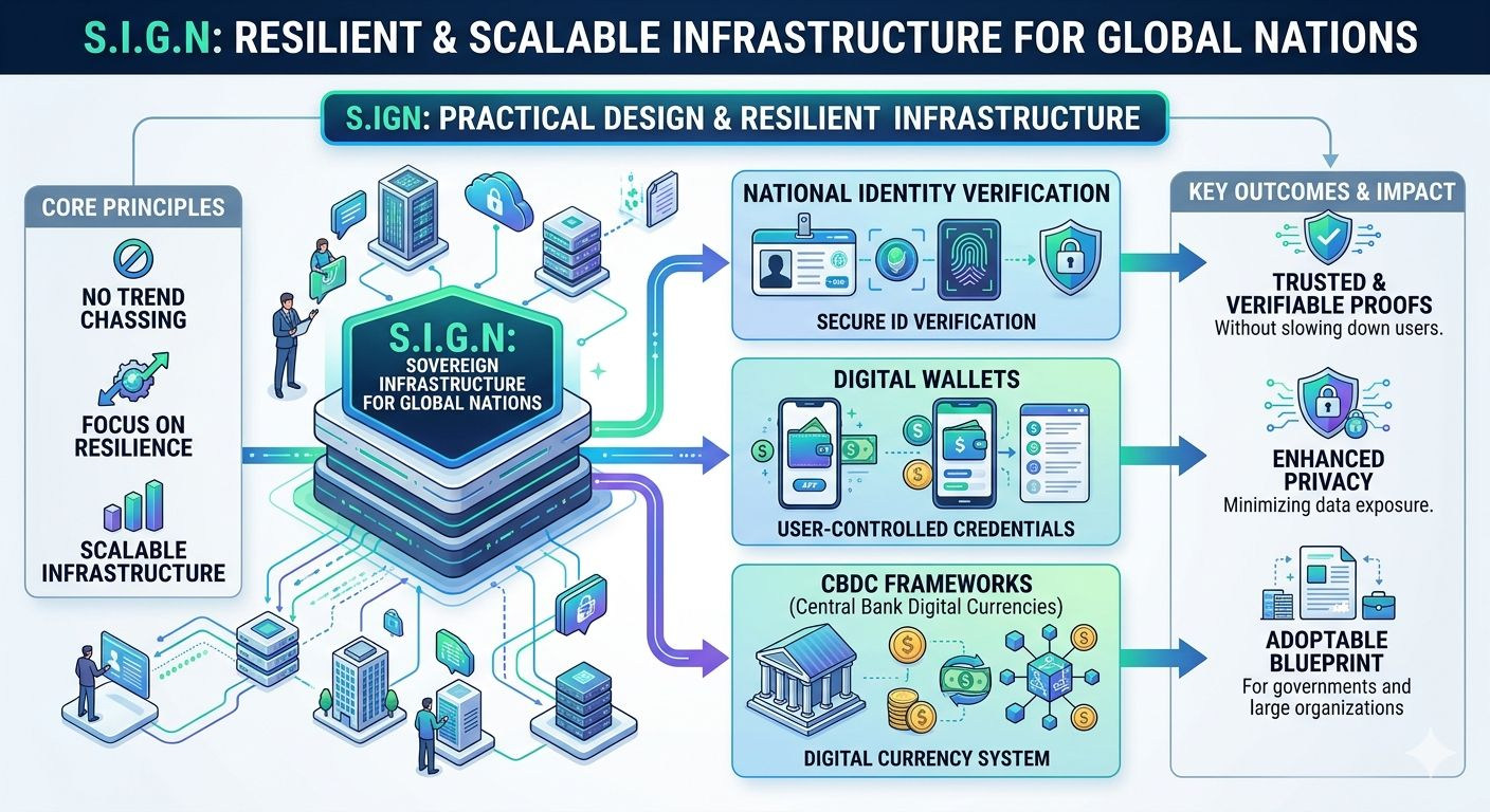 Una delle cose che trovo più interessanti riguardo a Sign è quanto sia pratico il suo design. Il progetto non insegue le tendenze o cerca di aggiungere ogni possibile funzionalità. Si concentra su ciò che conta: infrastruttura resiliente e scalabile. La spina dorsale di questo sistema è chiamata S.I.G.N, che sta per Infrastruttura Sovrana per le Nazioni Globali. È più di un semplice nome ingegnoso. È un progetto per sistemi digitali che i governi e le grandi organizzazioni possono adottare nella vita reale. Questo include la verifica dell'identità nazionale, portafogli digitali e persino quadri per le valute digitali delle banche centrali. L'obiettivo è creare un sistema in cui prove e credenziali possano essere fidate e verificate senza rallentare gli utenti o esporre dati non necessari.