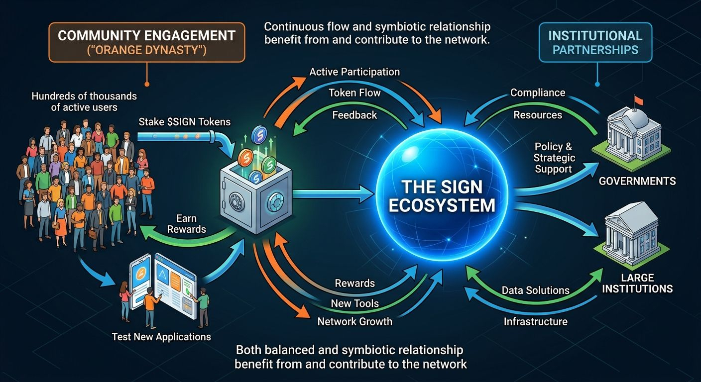 Il coinvolgimento della comunità è un'altra area in cui Sign brilla. La sua crescente comunità, a volte chiamata la Dinastia Arancione, include centinaia di migliaia di utenti attivi. Partecipano allo staking $SIGN token, guadagnando ricompense e aiutando a testare nuove applicazioni. Questo coinvolgimento della comunità completa il lavoro con i governi e le grandi istituzioni, creando un ecosistema equilibrato in cui sia gli individui che le organizzazioni traggono beneficio e contribuiscono alla rete.