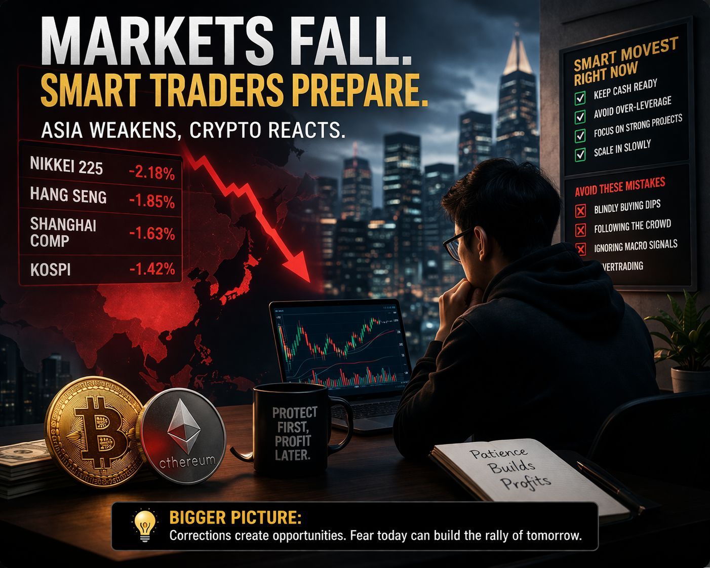 Asian stock markets are under pressure again, and if you’re in crypto, ignoring this is a mistake. Because when traditional markets shake, crypto doesn’t stay untouched.