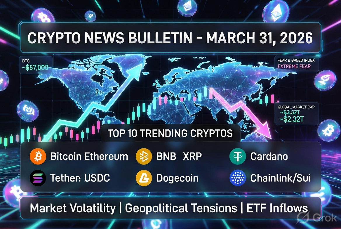**Crypto Market Snapshot:** The global cryptocurrency market trades around $2.32 trillion with moderate volatility amid geopolitical tensions, including uncertainties over the Iran conflict and rising U.S. real interest rates. Bitcoin dominance hovers near 58%, reflecting cautious investor preference for the flagship asset. Overall sentiment remains in "Extreme Fear" territory, with the market showing mixed signals as March concludes.