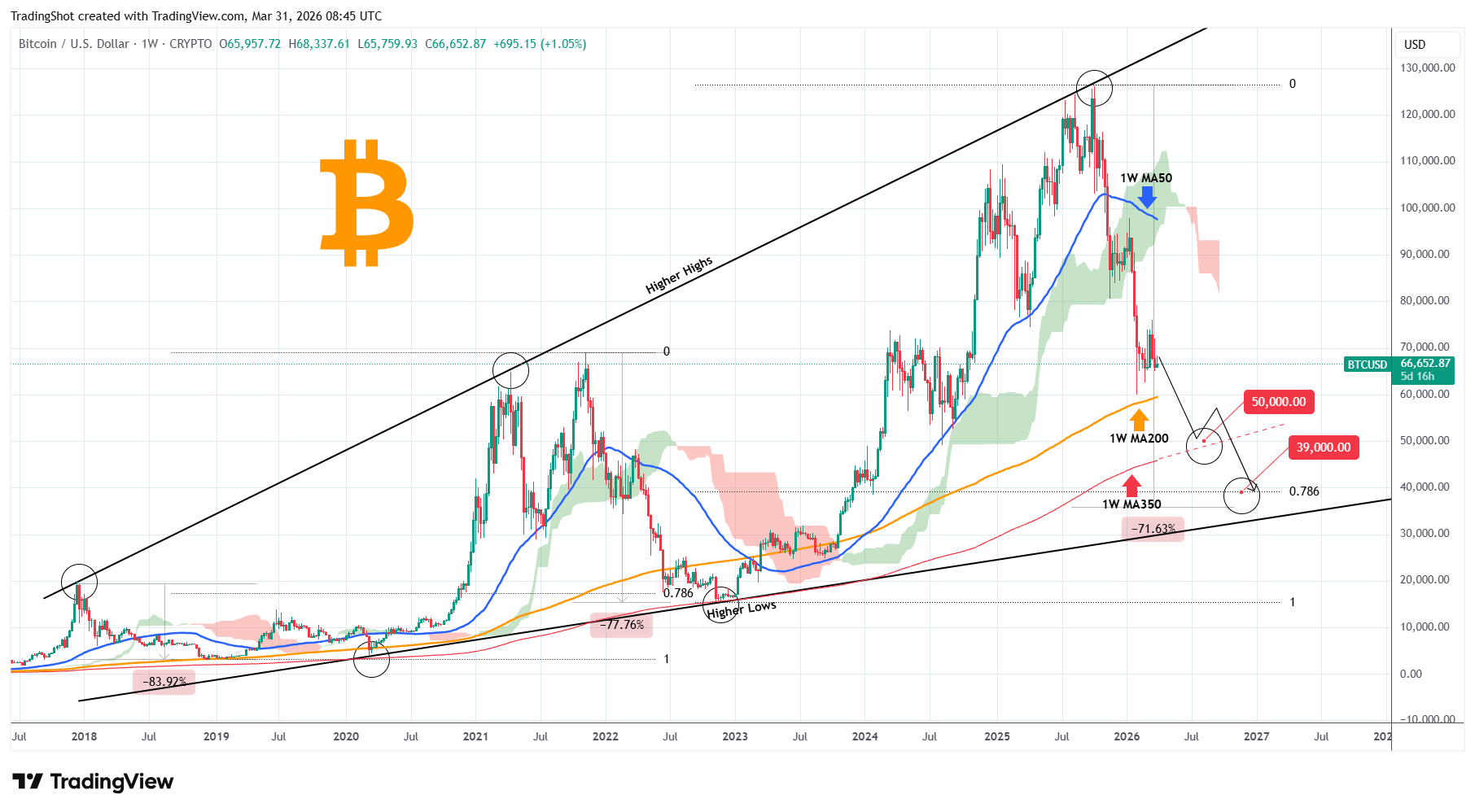 Se queste condizioni continuano a sussistere anche questa volta, BTC dovrebbe puntare ad almeno $50000, che sarà un test vicino al MA350 a 1W. Se c'è ancora tempo nel Ciclo di 4 anni e si estende, allora può scendere fino a $39000, che è il 0.786 Fib e ancora sopra un potenziale -71.70% (-6% meno rispetto al precedente Ciclo Orso).