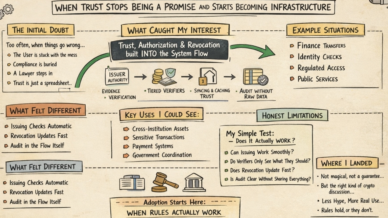 What slowly changed my mind here was that this did not seem to be only about proving facts. It was about how trust, authorization, revocation, and audit actually move through a system without forcing every single check through one fragile center. That sounds technical, maybe even dry, but I think it points to a much more real problem than people usually admit. In serious systems, the issue is not just whether something can be verified once. The issue is who is allowed to issue, who is allowed to check, how that trust gets updated, and what happens when permissions or status change later.